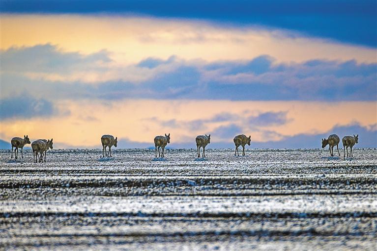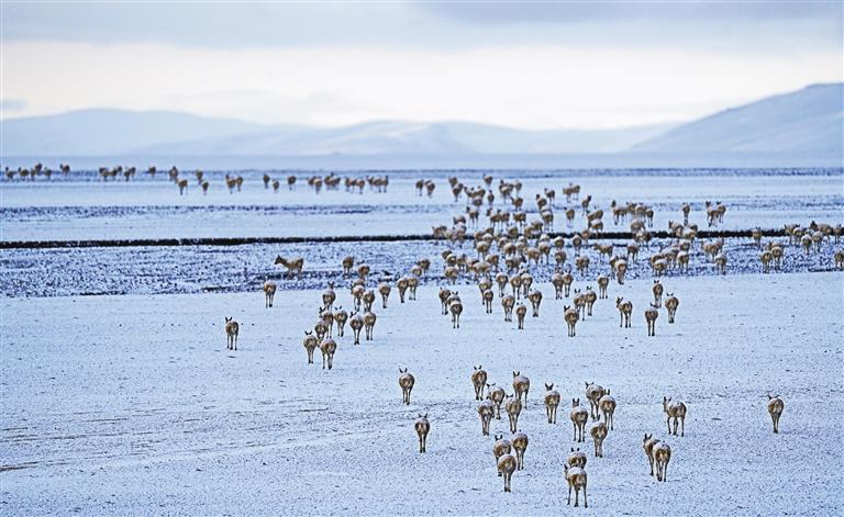 藏羚羊在甜水河畔雪地荒灘上向產(chǎn)羔地遷徙(6月15日攝)。 新華社記者 姜帆 攝