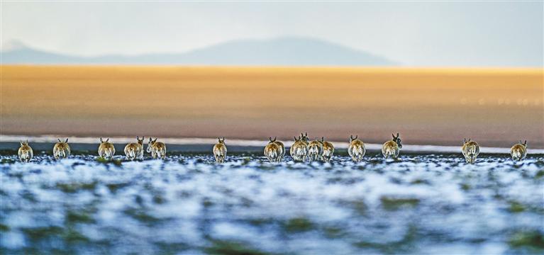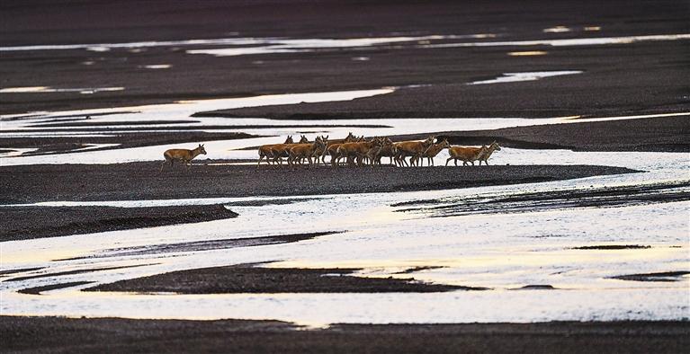 6月13日傍晚,在羌塘國家級自然保護區(qū),遷徙中的母藏羚羊越過甜水河。 新華社記者 費茂華 攝
