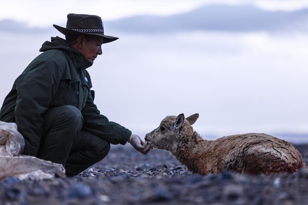 羅布嫻熟地用酒精清潔創(chuàng)面,手持針線慢慢地縫合她的肚皮——這場手術(shù)進行了50分鐘,母藏羚羊漸漸可以動了,她用鼻尖蹭了一下羅布的手,掙扎著起身,緩緩?fù)鶘|走去——那里是產(chǎn)羔地。