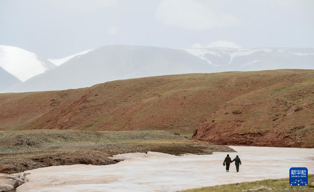 6月15日,羌塘國(guó)家級(jí)自然保護(hù)區(qū)野生動(dòng)物專(zhuān)業(yè)管護(hù)隊(duì)員索朗(左)和羅布檢查河面冰凍情況。新華社記者 晉美多吉 攝