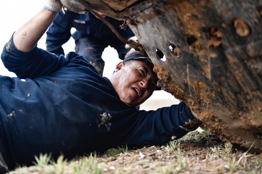 2020年7月6日,卓乃湖保護(hù)站站長秋培扎西在可可西里地區(qū)修理車輛。新華社記者 張龍 攝