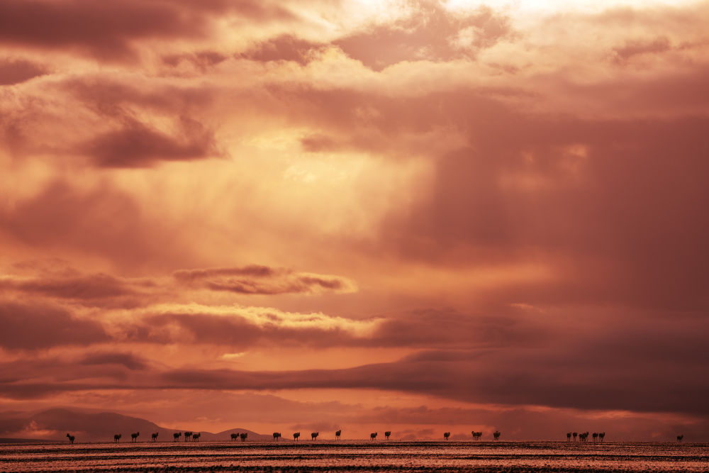 2024年6月15日清晨雪后,在西藏羌塘國家級(jí)自然保護(hù)區(qū),一群藏羚羊迎著朝霞前行在遷徙路上。