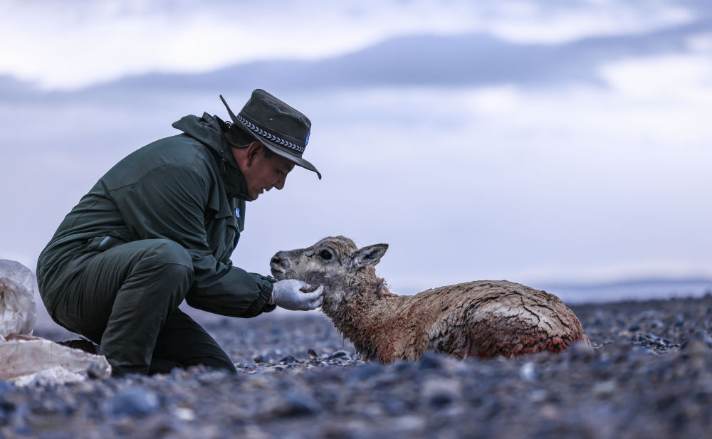 2024年6月14日,野生動(dòng)物專業(yè)管護(hù)隊(duì)員在西藏羌塘國家級(jí)自然保護(hù)區(qū)核心區(qū)安撫受傷的母藏羚羊。