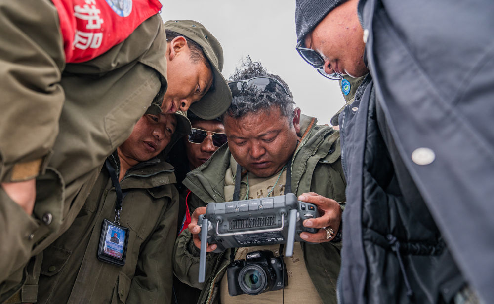 2024年5月10日,在西藏羌塘國家級(jí)自然保護(hù)區(qū),羅布玉杰管護(hù)站站長(zhǎng)格桑倫珠(右二)和隊(duì)員們?cè)诖笱┲胁僮鳠o人機(jī)觀察藏羚羊遷徙情況。