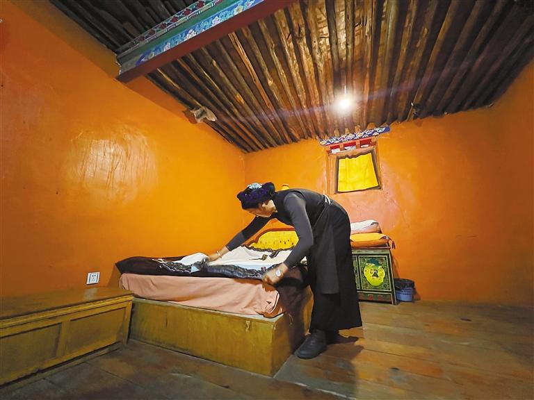 扎西頓珠的妻子在進(jìn)行客房清潔。