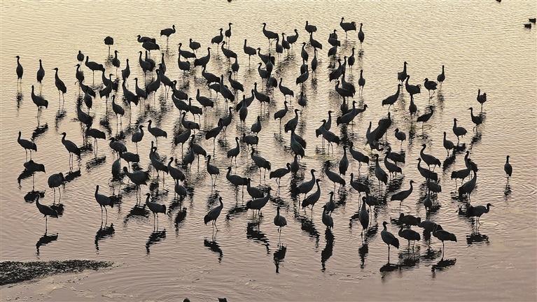 黑頸鶴是全球15種鶴類中唯一在高原地區(qū)生活、繁殖的鶴類,屬國家一級保護(hù)動物。每年10月中下旬,大批黑頸鶴從藏北高原飛到拉薩河谷,它們在農(nóng)田、沼澤地里覓食嬉戲,享受冬日暖陽。