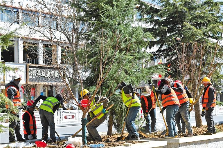 圖為養(yǎng)護(hù)工人在種樹(shù)。記者 洛桑 攝