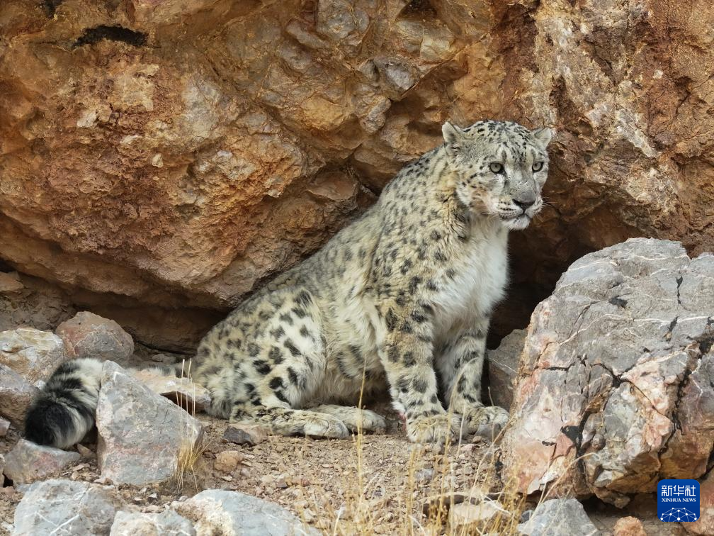 西藏阿里改則縣改則鎮(zhèn)玉多村附近巖山區(qū)域拍攝到的國家一級保護(hù)動物雪豹(4月18日攝)。新華社發(fā)(索朗仁青 攝)