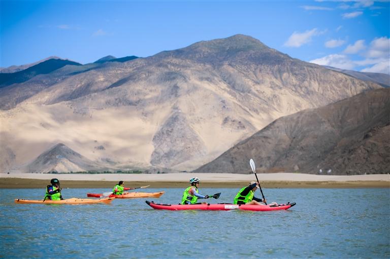 水上皮劃艇項(xiàng)目起點(diǎn)位于桑耶渡口,終點(diǎn)是雅魯藏布江觀景臺(tái)。這里江面寬8至12公里,是雅魯藏布江的最寬處,北接國(guó)家4A級(jí)旅游景區(qū)桑耶寺,南臨第一莊園朗塞嶺,是絕佳的觀景、拍攝地。最后的越野跑項(xiàng)目沿著雅魯藏布江邊進(jìn)行。