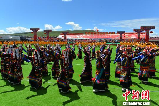 2019年8月10日,西藏那曲牧民參加一年一度的賽馬節(jié)。圖為當?shù)嘏越M成的大型鍋莊舞團隊在開幕式上進行表演。(資料圖) 江飛波 攝