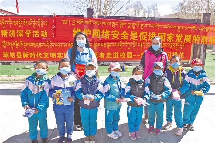 志愿者向瓊結(jié)鎮(zhèn)小學(xué)學(xué)生發(fā)放學(xué)習(xí)用具,開(kāi)展“綠書(shū)簽”活動(dòng)。記者 洛桑 次旺 攝