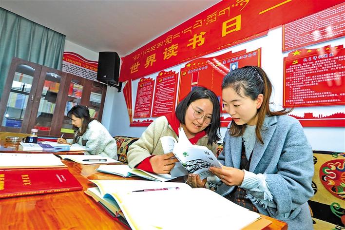 拉薩市墨竹工卡縣教育局干部職工在黨員活動(dòng)室內(nèi)閱讀圖書(shū)。洛克 記者 唐斌 攝