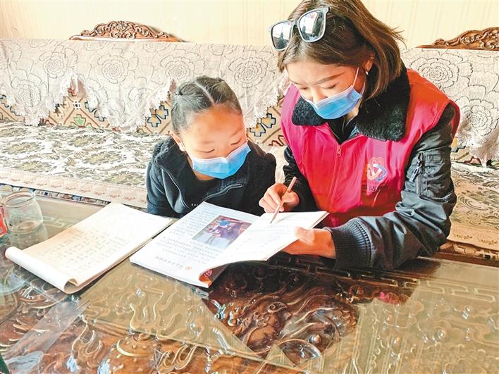 西藏那曲索縣“四講四愛”宣講團成員在進行入戶宣講的同時,積極開展送教活動。圖為索縣廣電中心副主任科員兼“四講四愛”辦工作人員次仁德吉入戶為學(xué)生輔導(dǎo)課后作業(yè)。記者 萬靖 張宇 攝