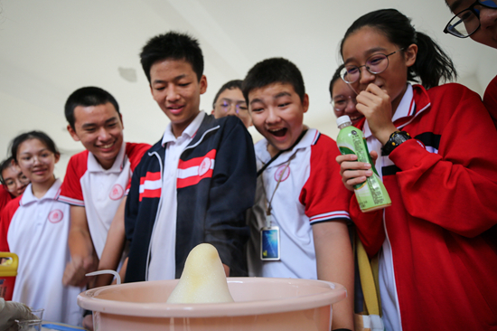 10月26日,北京師范大學(xué)??诟綄賹W(xué)校的學(xué)生參與化學(xué)趣味實(shí)驗(yàn)。當(dāng)日,北京師范大學(xué)海口附屬學(xué)校舉行第三屆科技人文節(jié)活動(dòng),在校內(nèi)營(yíng)造愛科學(xué)、學(xué)科學(xué)的良好氛圍。
