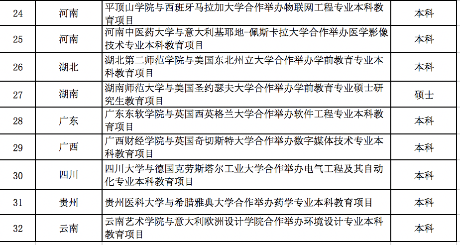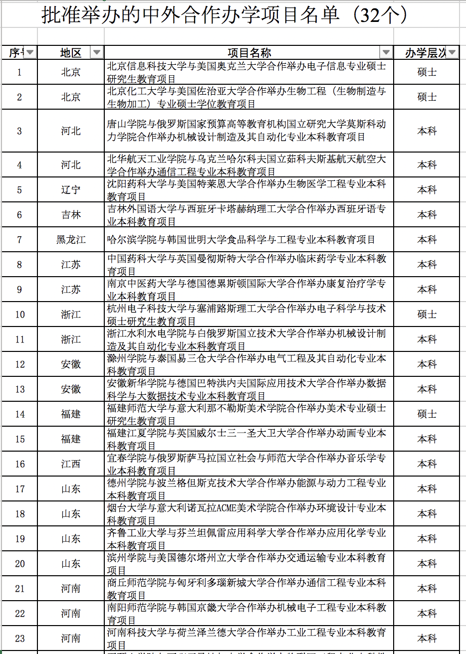 名單顯示,32個中外合作辦學(xué)項目中,河南、山東等地被批準(zhǔn)項目最多,分別有5個和4個項目獲批。據(jù)悉,2019年下半年,河南省也有4個項目獲批,新增項目數(shù)居全國前列。