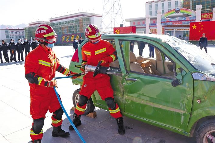 阿里地區(qū)消防員在演示汽車破拆救援。圖片由西藏自治區(qū)消防救援總隊(duì)提供