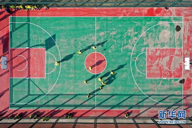11月12日,學(xué)生在大課間打籃球(無人機(jī)照片)。 位于山東省青島市即墨區(qū)的青島藍(lán)谷高新區(qū)東皋埠小學(xué)是一所鄉(xiāng)村學(xué)校,近年來,學(xué)校開展以乒乓球、籃球、跳繩等運(yùn)動(dòng)為主的大課間活動(dòng),讓孩子們?cè)谙硎苓\(yùn)動(dòng)的同時(shí)愉悅身心,增強(qiáng)體質(zhì)。 新華社發(fā)(梁孝鵬攝)