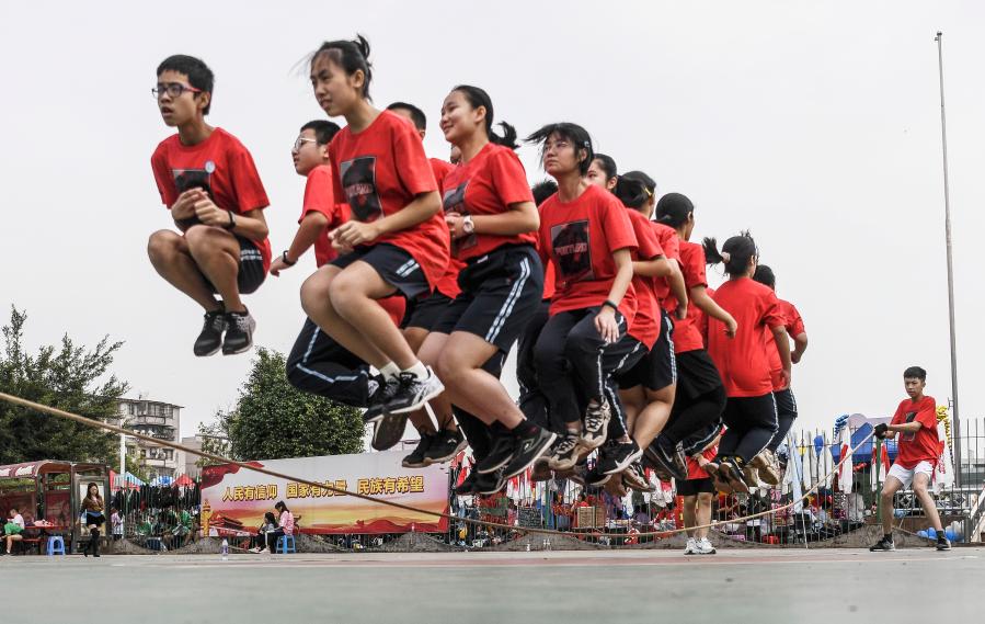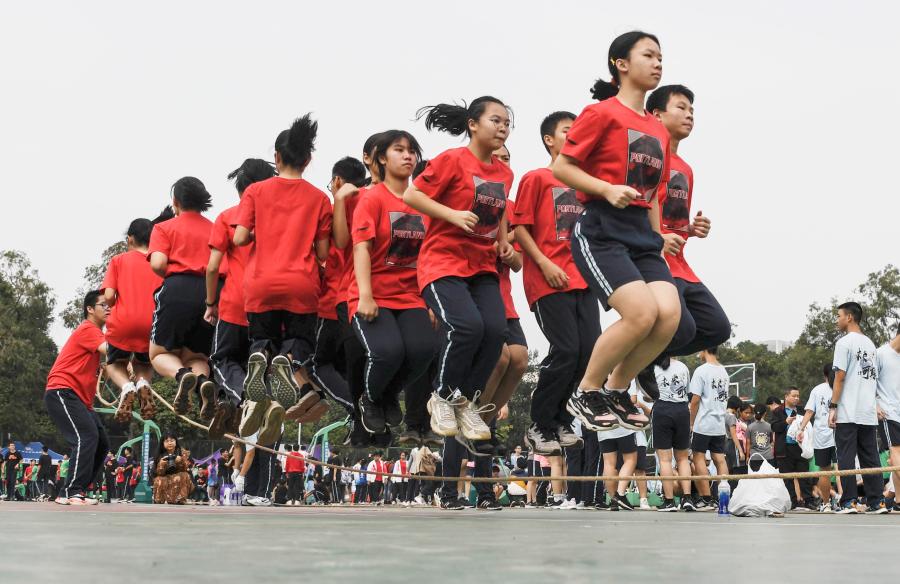 11月26日, 廣西大學(xué)附屬中學(xué)初中年級(jí)學(xué)生在集體跳繩比賽中。新華社記者張愛(ài)林?jǐn)z
