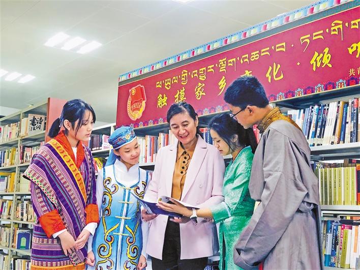 圖為共青團(tuán)西藏自治區(qū)委員會(huì)副書(shū)記格桑卓瑪(左三)向武漢西藏中學(xué)的學(xué)生們介紹“觸摸家鄉(xiāng)變化·傾聽(tīng)黨的聲音”主題書(shū)刊。央金 攝