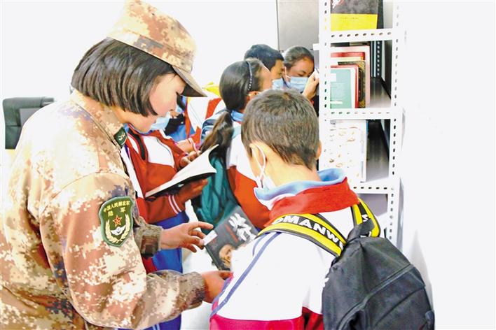 圖為部隊官兵在向?qū)W生介紹部隊圖書室藏書情況。段敏 攝