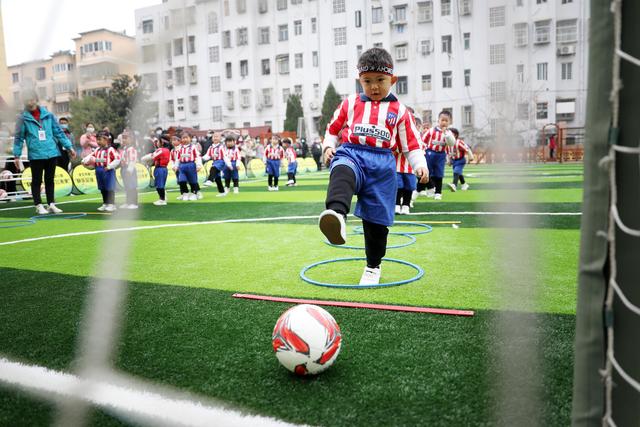 12月7日,淮北市第二實驗幼兒園的小朋友在足球課上學習踢足球。