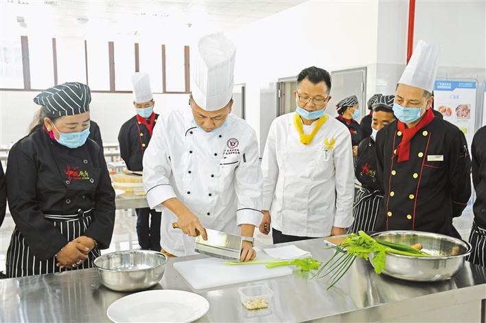 圖為在林芝技工學?!盎洸藥煾怠奔寄芘嘤栒n上,粵菜老師正在為學員講解粵菜制作方法。張猛 胡文 攝