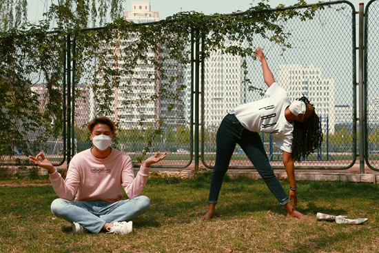 2020年4月14日,北京,對(duì)外經(jīng)濟(jì)貿(mào)易大學(xué)的來(lái)華留學(xué)生在戶外鍛煉。李享/攝