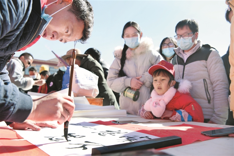 書(shū)法家現(xiàn)場(chǎng)揮毫潑墨,為群眾寫(xiě)下祝福的文字。