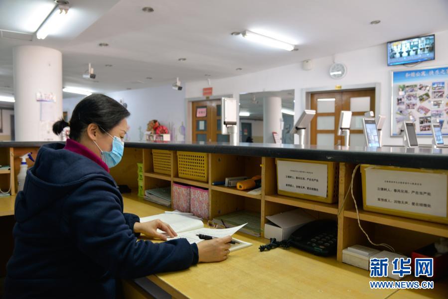 2月8日,北京交通大學(xué)學(xué)生公寓中心值班員李立在22號公寓大廳查看值班記錄。新華社記者 徐欽 攝