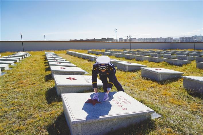 那曲市消防救援支隊隊員在擦拭革命烈士墓碑。肖暄 攝