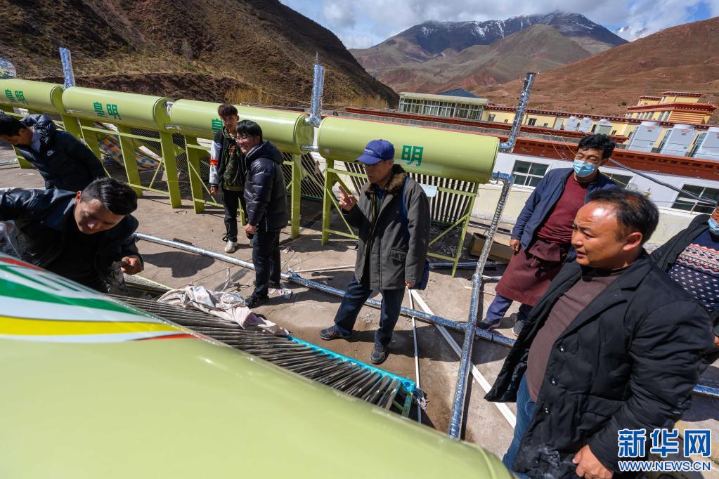 5月3日,在西藏昌都市類烏齊縣吉多鄉(xiāng)小學(xué),李純民(中)在吉多鄉(xiāng)小學(xué)學(xué)生食堂樓頂,監(jiān)督太陽能熱水器的維修工作。2014年至2020年,“齊興”助學(xué)獎(jiǎng)勵(lì)基金通過多種方式,籌集資金200多萬,為類烏齊縣12所鄉(xiāng)鎮(zhèn)小學(xué)安裝太陽能熱水器和多媒體教學(xué)一體機(jī)。新華社記者 劉金海 攝