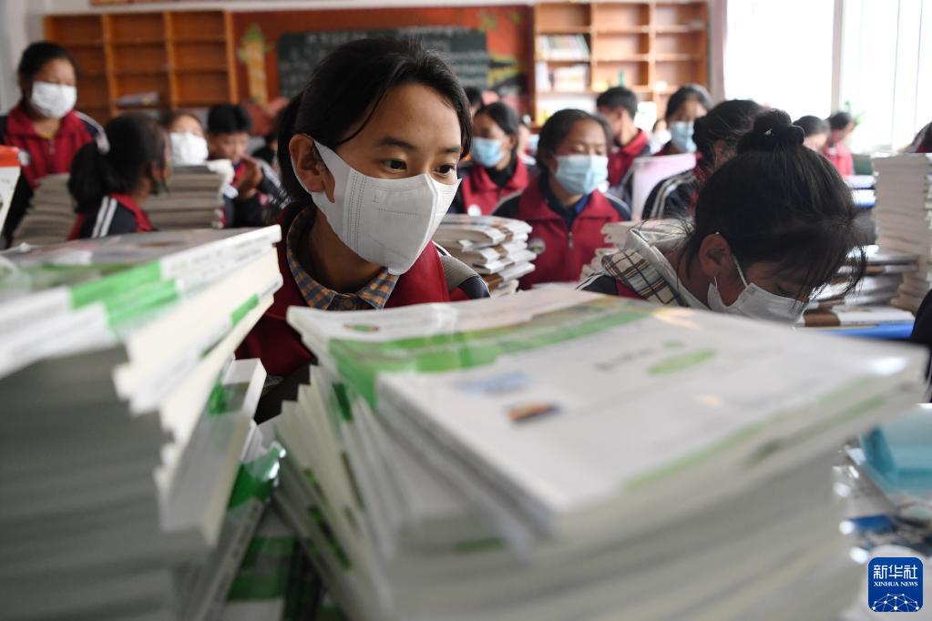 碌曲縣藏族中學(xué)的高二學(xué)生在教室里整理新學(xué)期課本(8月30日攝)。新華社記者 陳斌 攝