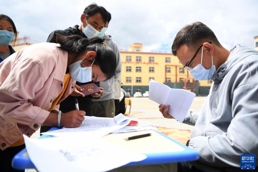 碌曲縣藏族中學(xué)高一新生填寫報(bào)到信息(8月30日攝)。新華社記者 杜哲宇 攝