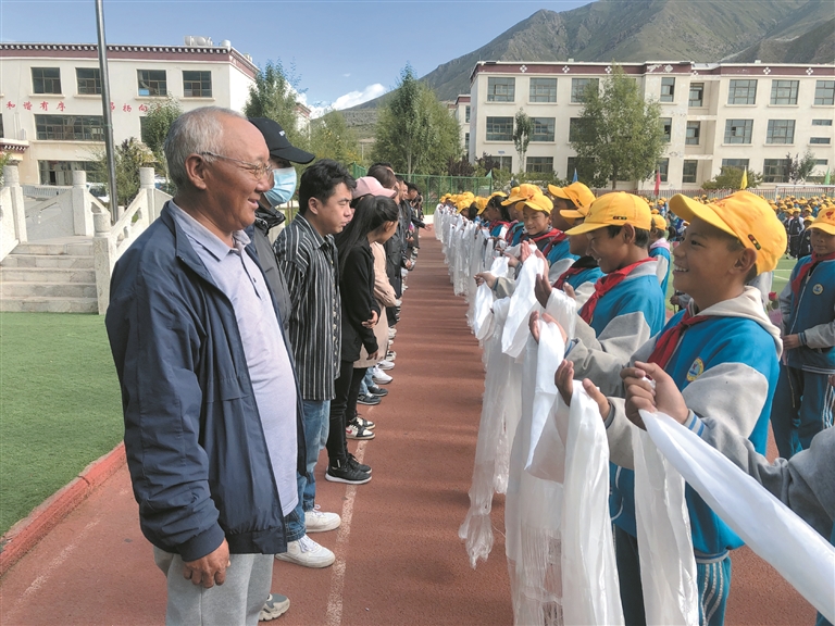 在堆龍德慶區(qū)馬鎮(zhèn)中心小學(xué),學(xué)生們向老師敬獻(xiàn)哈達(dá),送上節(jié)日祝福。