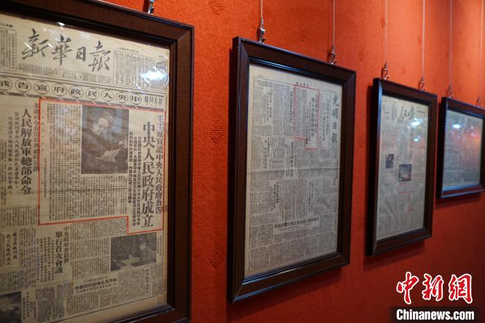 “這份最為寶貴,”索昂生格指著廊邊的第一幅相框,是《新華日?qǐng)?bào)》1949年10月2日的報(bào)紙,頭版“中央人民政府宣告成立”大字醒目,“它見(jiàn)證了歷史?!?/p>