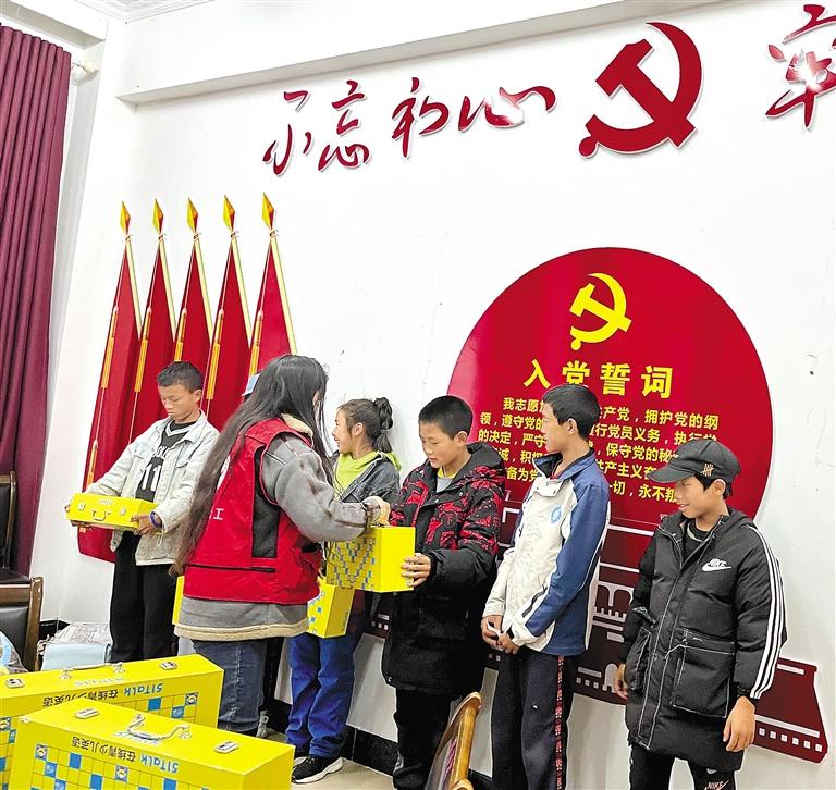 圖為工作人員向事實(shí)無(wú)人撫養(yǎng)兒童發(fā)放圖書。記者 胡文 王珊 張猛 攝