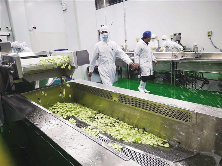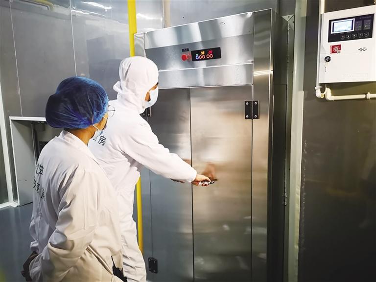 通過員工通道,在該廚房生產(chǎn)廠長甘文忠的指導下,記者穿上了白色工作服、戴上食品安全帽,換上高筒膠鞋,洗手消毒、測量體溫、隨身攜帶的手機、首飾全部摘掉后,通過腳踏池進入生產(chǎn)加工車間。