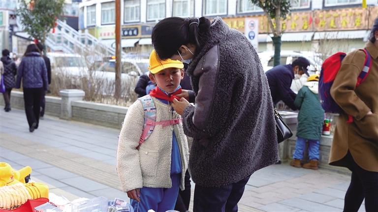 10日早上8時(shí)20分許,小學(xué)生們佩戴鮮艷的紅領(lǐng)巾、頭戴小黃帽,陸陸續(xù)續(xù)走進(jìn)拉薩市第一小學(xué)的校門。今年春季開學(xué)第一天,有些家長蹲在孩子面前,幫忙整理衣帽,同時(shí)鼓勵孩子“加油!”。