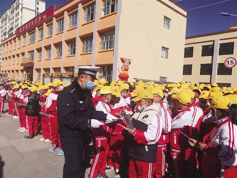 民警給學(xué)生發(fā)放交通安全宣傳資料。圖由 拉薩交警 提供