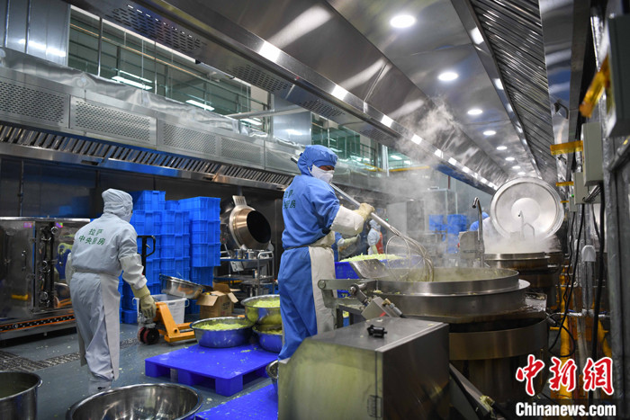 圖為3月11日,西藏自治區(qū)拉薩市城關(guān)區(qū)凈土拉薩中央廚房?jī)?nèi),廚師們?cè)谂腼儗W(xué)生營(yíng)養(yǎng)午餐。 中新社記者 貢嘎來松 攝
