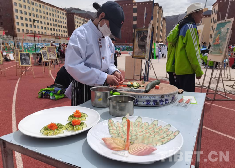 圖為來自察雅縣的加永卓瑪同學展示自己冷拼作品“孔雀開屏”