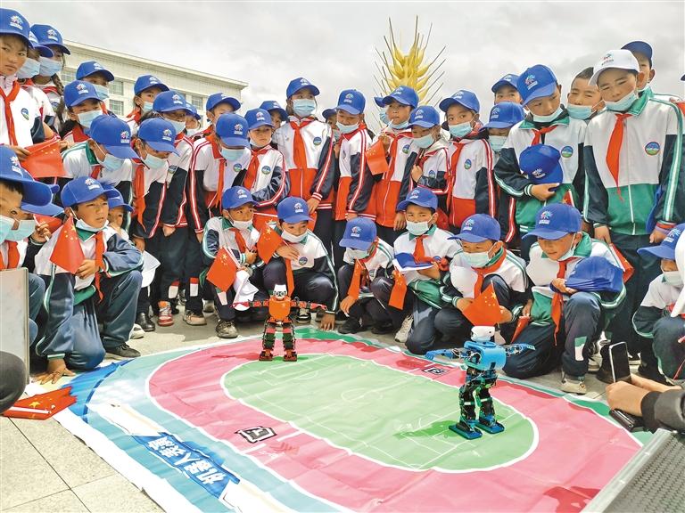 圖為啟動(dòng)儀式現(xiàn)場(chǎng),學(xué)生圍觀科技產(chǎn)品“機(jī)器人跳舞”的場(chǎng)景。記者 扎西頓珠 攝