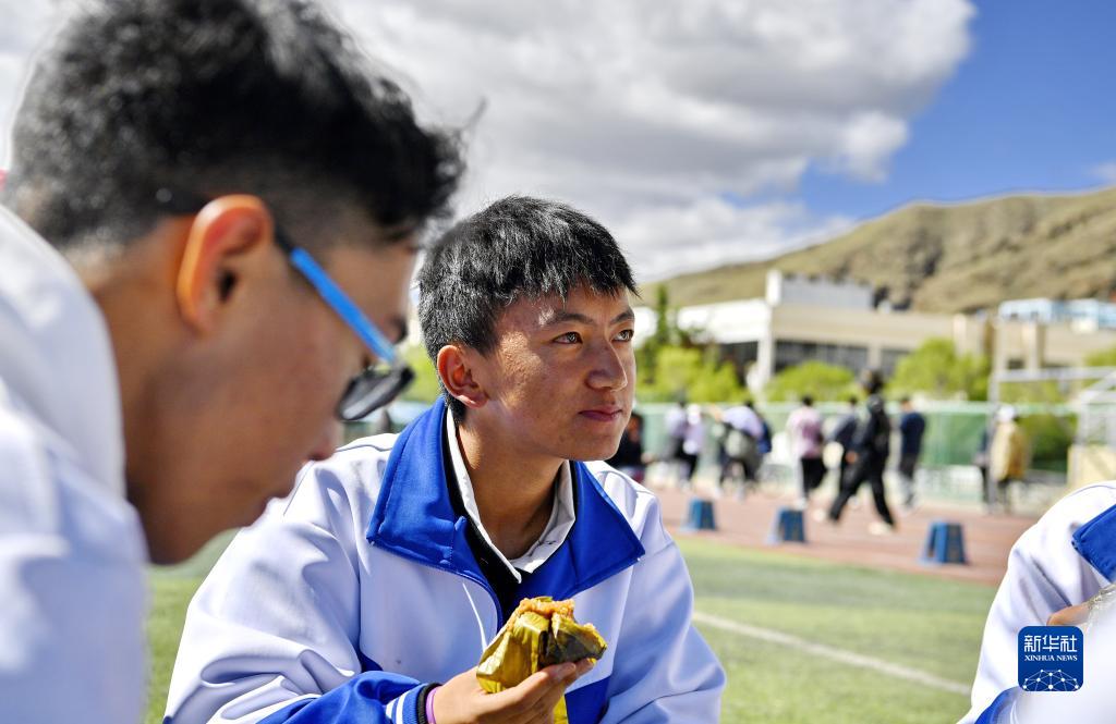 山南市第二高級中學(xué)的學(xué)生在操場吃粽子(6月3日攝)。新華社記者 劉洲鵬 攝