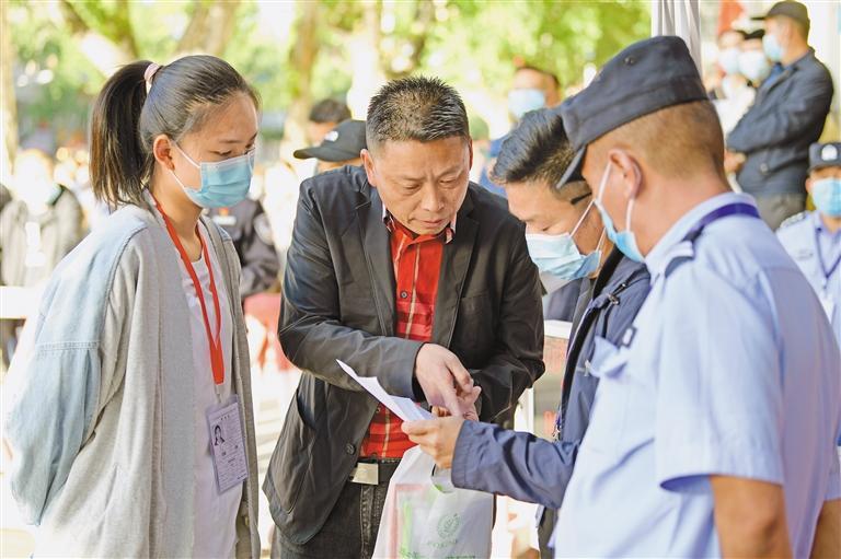 圖為拉薩中學(xué)考點(diǎn)門前,民警正在為考生家長(zhǎng)提供幫助。記者 唐斌 攝