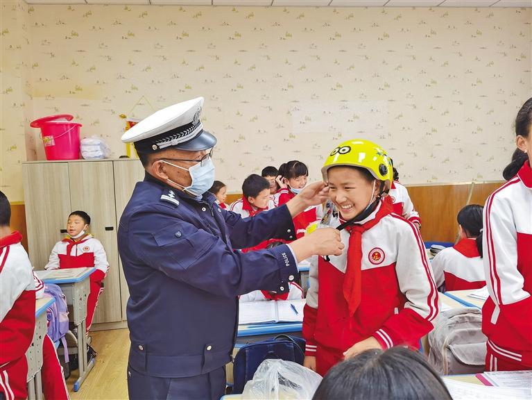 圖為民警正在教學(xué)生如何正確佩戴安全頭盔。記者 鹿麗娟 攝