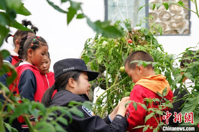 圖為亞?wèn)|出入境邊防檢查站民警楊琳帶著龐達(dá)村雙語(yǔ)幼兒園小朋友認(rèn)識(shí)成熟了的西紅柿?!±铄\輝 攝