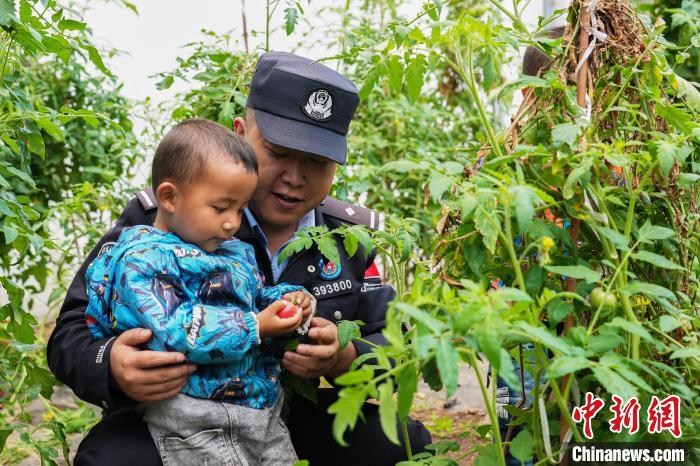 圖為亞?wèn)|出入境邊防檢查站民警與龐達(dá)村雙語(yǔ)幼兒園小朋友共同采摘成熟了的西紅柿?!±铄\輝 攝