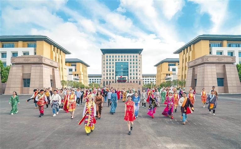 各族學生從新建成的西藏民族大學教學樓健步走出。