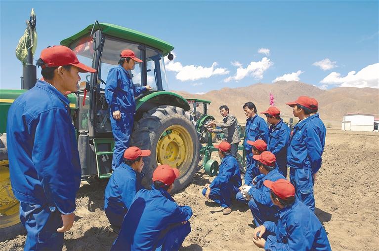 發(fā)展教育脫貧一批。2016年以來,累計落實義務教育學校基本建設資金84.4億元,實施教育基礎建設項目1433個,資助建檔立卡和農(nóng)村低保大學生累計6.06萬人次,落實資助資金3.55億元。圖為西藏自治區(qū)白朗縣邀請山東農(nóng)機技師對當?shù)刎毨糸_展培訓。