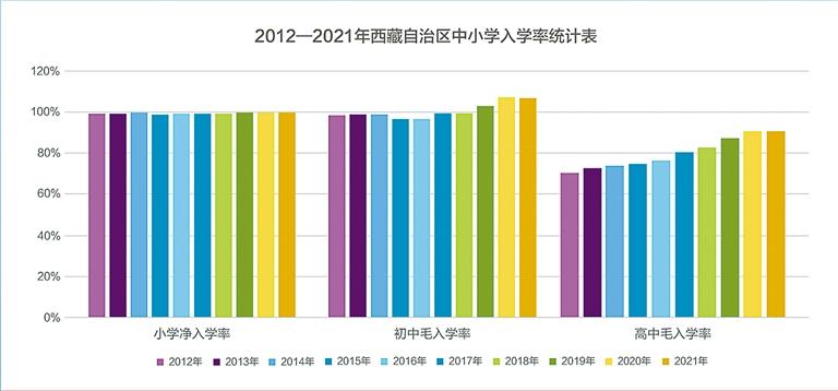 教育事業(yè)成果豐碩。全區(qū)共有各級各類學校3339所,在校學生92萬人。圖為西藏自治區(qū)中小學入學率統(tǒng)計表。